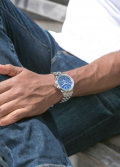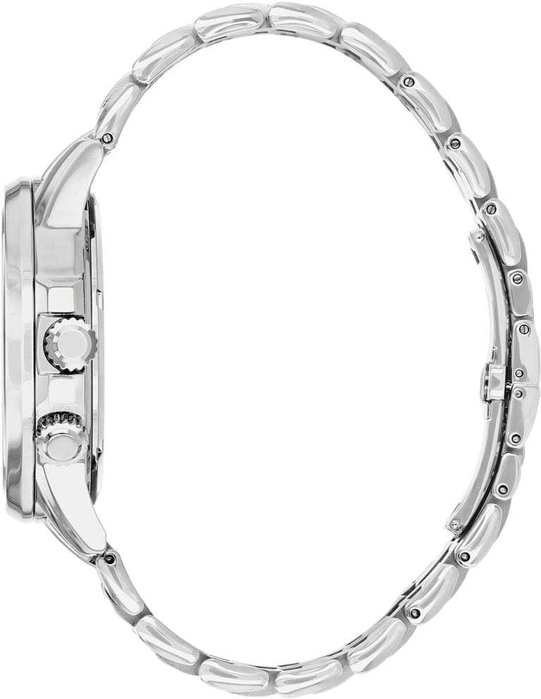 Циферблат с метками в виде штрихов. Число и день недели вынесены на отдельные циферблаты. Рифленая заводная головка с защитой. Браслет с раскладывающейся застежкой.