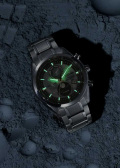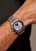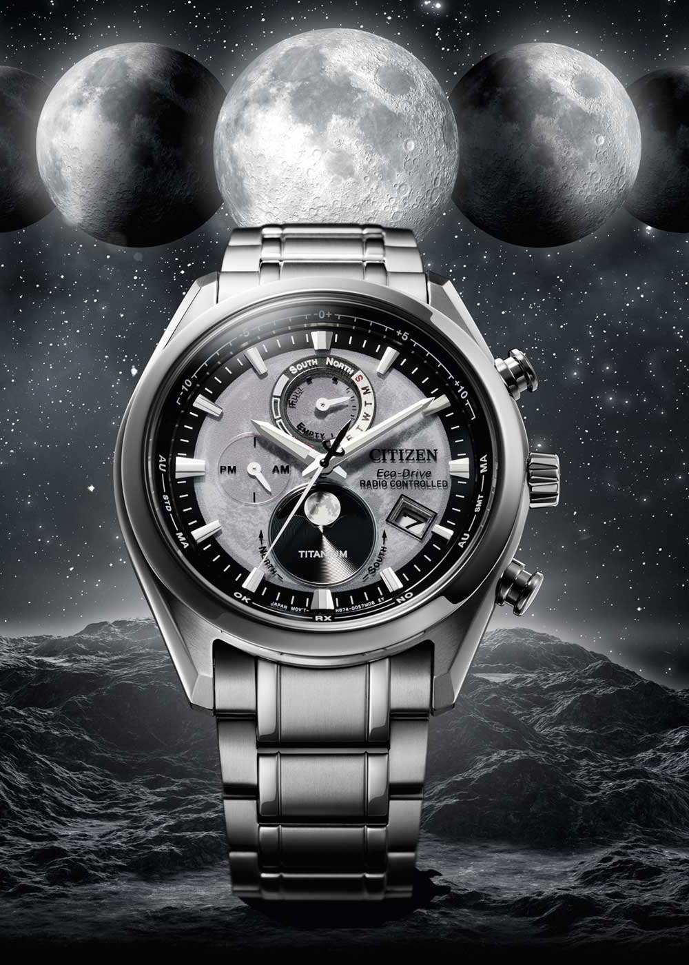 Текстурированный циферблат вдохновлен поверхностью луны и защищен прочным сапфировым стеклом. Метки в виде штрихов. Окошко даты находится в положении 4 часа. Ретроградный указатель дня недели. Браслет с раскладывающейся застежкой.
