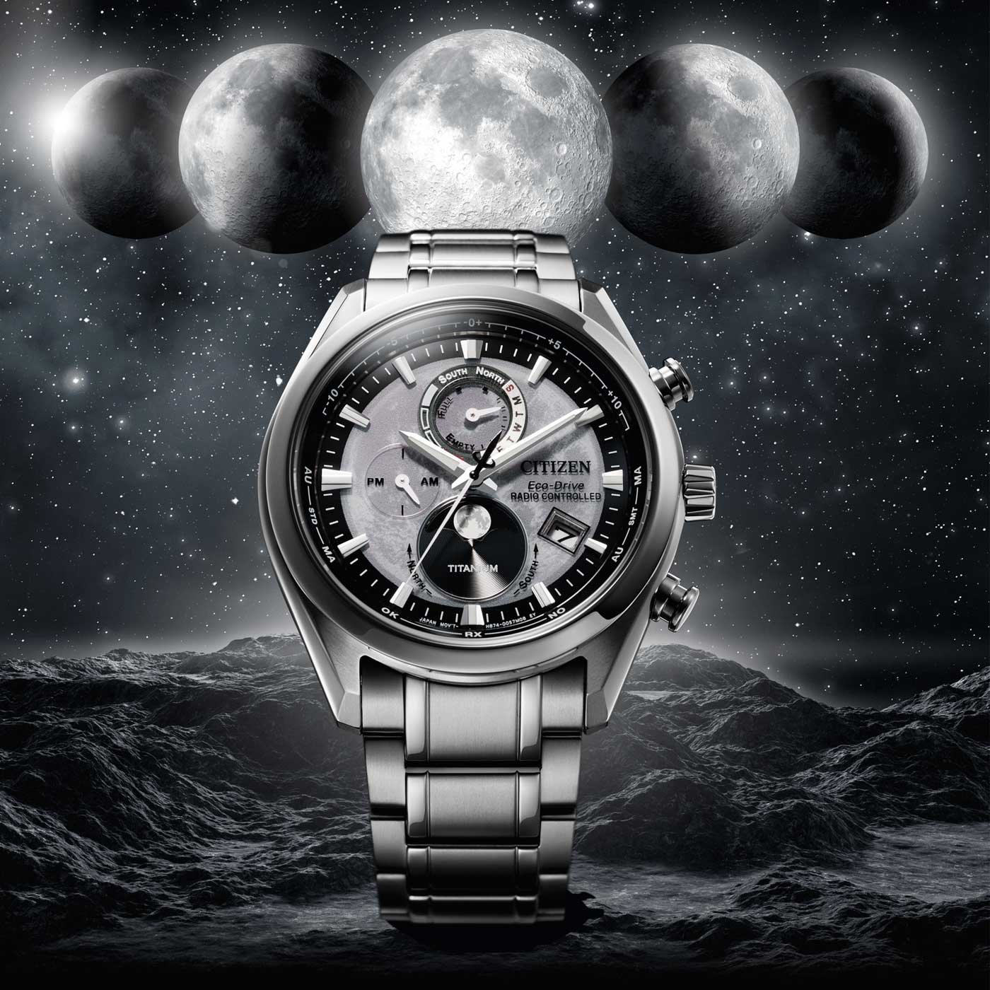 - 24 города, переход на зимнее и летнее время. Автоматический индикатор фаз Луны. Функция переключения отображения фаз Луны между северным и южным полушарием. Ручная калибровка фаз Луны. Текстурированный циферблат вдохновлен поверхностью луны и защищен прочным сапфировым стеклом. Метки в виде штрихов. Окошко даты находится в положении 4 часа. Ретроградный