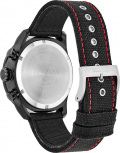 Метки в виде штрихов и арабских цифр. Окошко даты находится между отметками 4 и 5 часов. Ремешок с классической застежкой и красной строчкой.