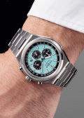 Текстурный циферблат с накладными метками в виде штрихов защищен прочным сапфировым стеклом. Окошко даты находится между отметками 4 и 5 часов. Завинчивающаяся задняя крышка. Браслет с раскладывающейся застежкой.