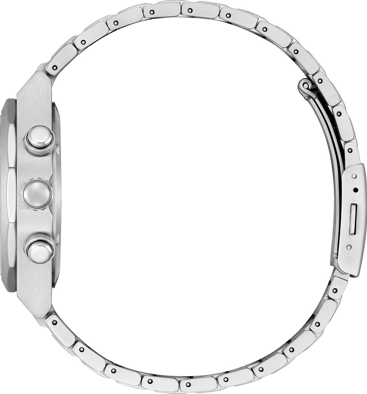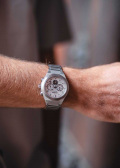 Текстурный циферблат с накладными метками в виде штрихов защищен прочным сапфировым стеклом. Окошко даты находится между отметками 4 и 5 часов. Завинчивающаяся задняя крышка. Браслет с раскладывающейся застежкой.