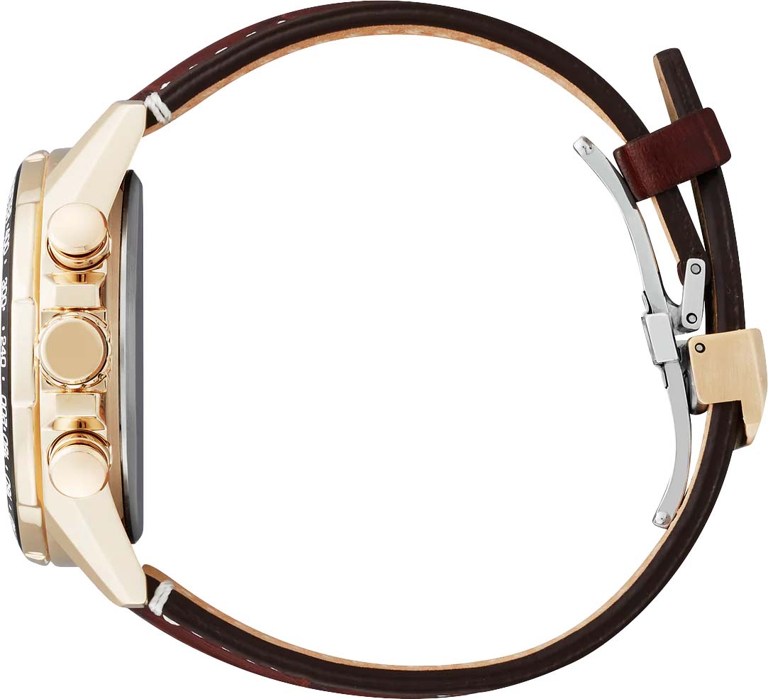 Циферблат с метками в виде штрихов защищен прочным сапфировым стеклом. Ретроградный указатель дня недели. Окошко даты находится в положении 4 часа. Заводная головка с защитой. Ремешок с раскладывающейся застежкой.