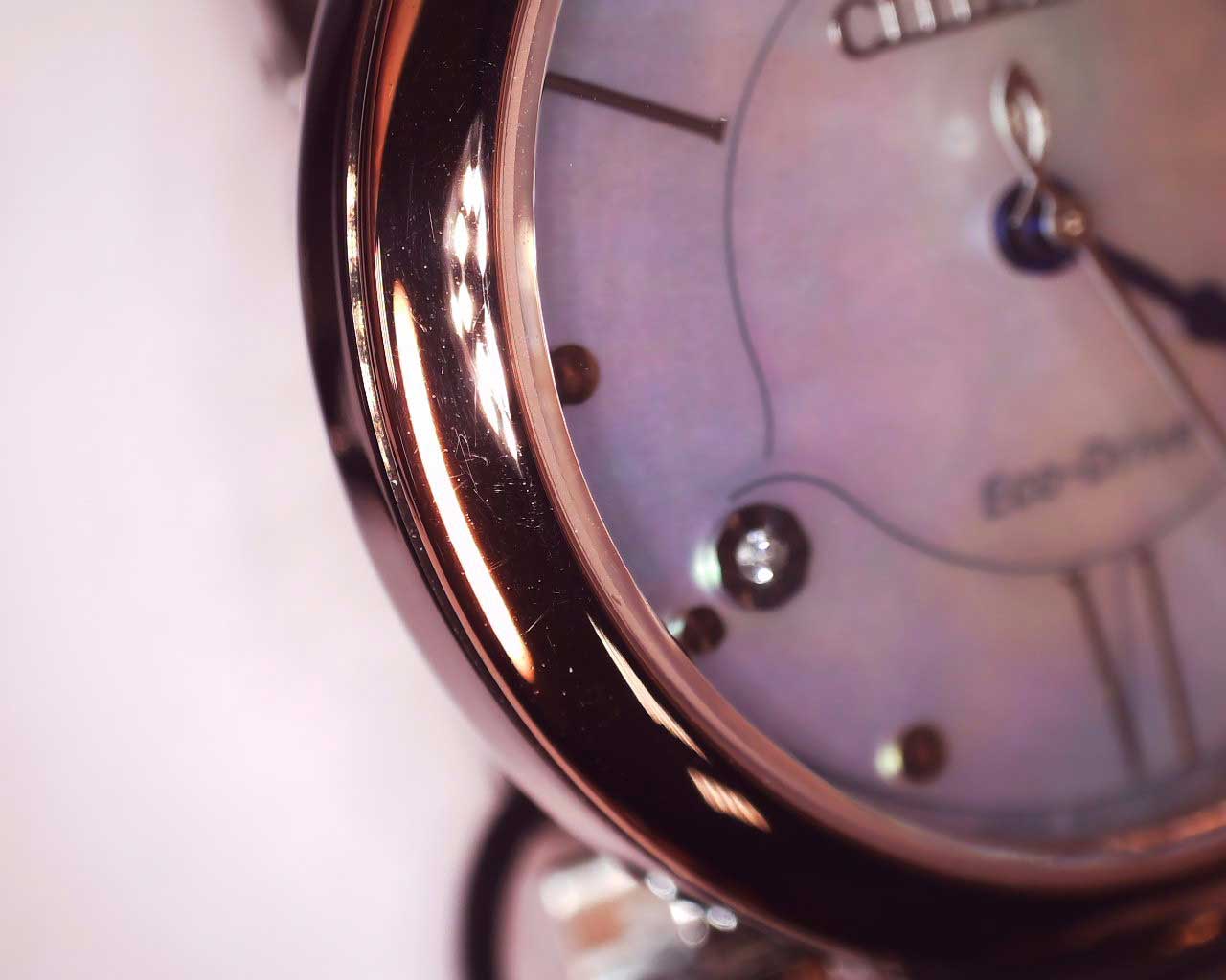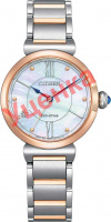 Citizen L May bells. Система Eco-Drive, не требующая замены батарейки. Питание от солнечной энергии, запас энергии на 180 дней. Функция индикации заряда (EOL) и предотвращения перезарядки. Перламутровый циферблат защищен прочным сапфировым стеклом. Заводная головка украшена камнем в форме кабошона. Браслет с раскладывающейся застежкой.