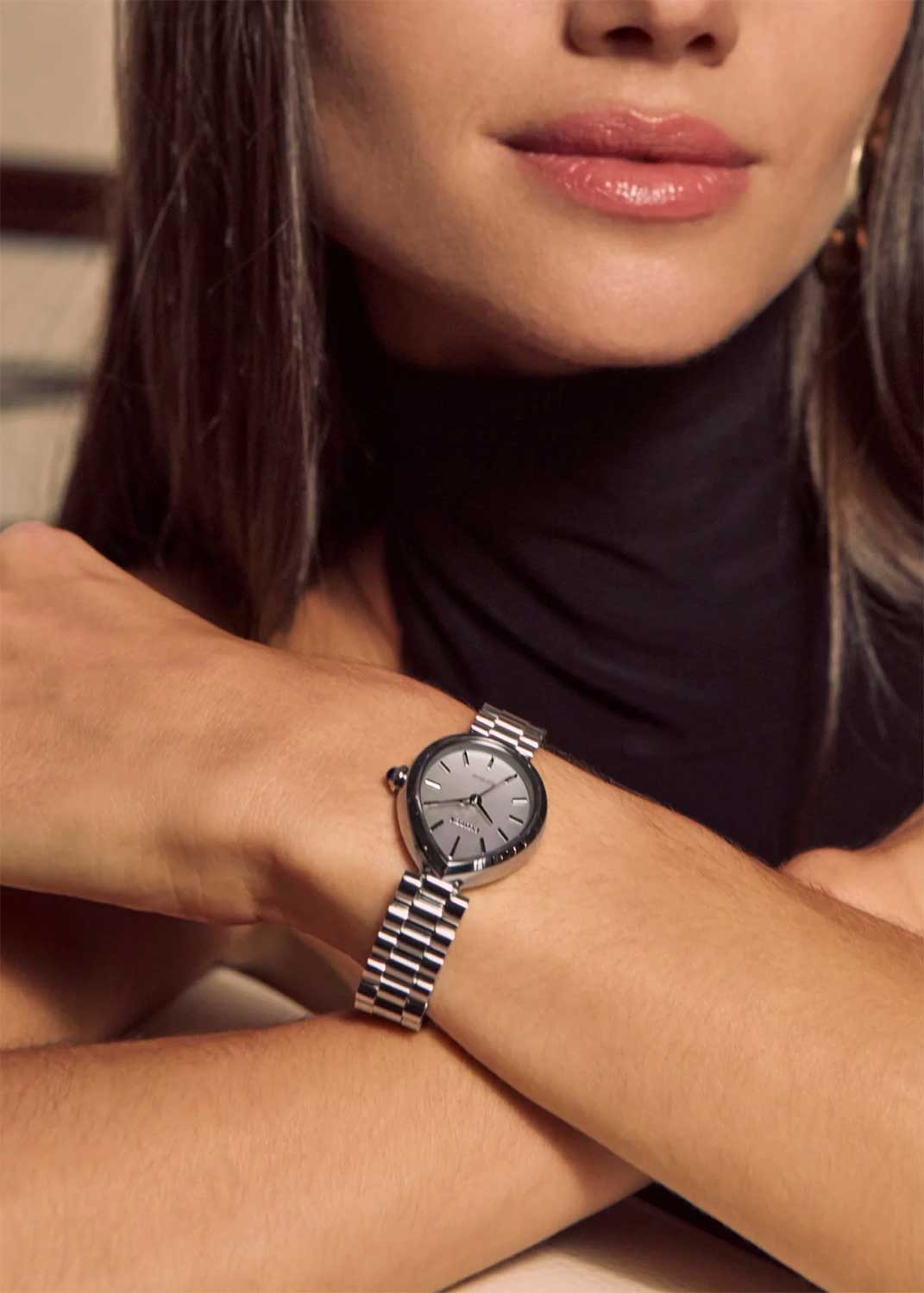 Циферблат с метками в виде штрихов защищен прочным сапфировым стеклом. Заводная головка украшена камнем в форме кабошона. Задняя крышка крепится на 4-х винтах. Браслет с раскладывающейся застежкой.