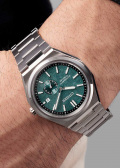 Метки и стрелки с люминесцентным покрытием, которое светится в темноте после непродолжительной зарядки на свету. Окошко даты находится в положении 3 часа. Прозрачная задняя крышка. Браслет с раскладывающейся застежкой.