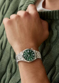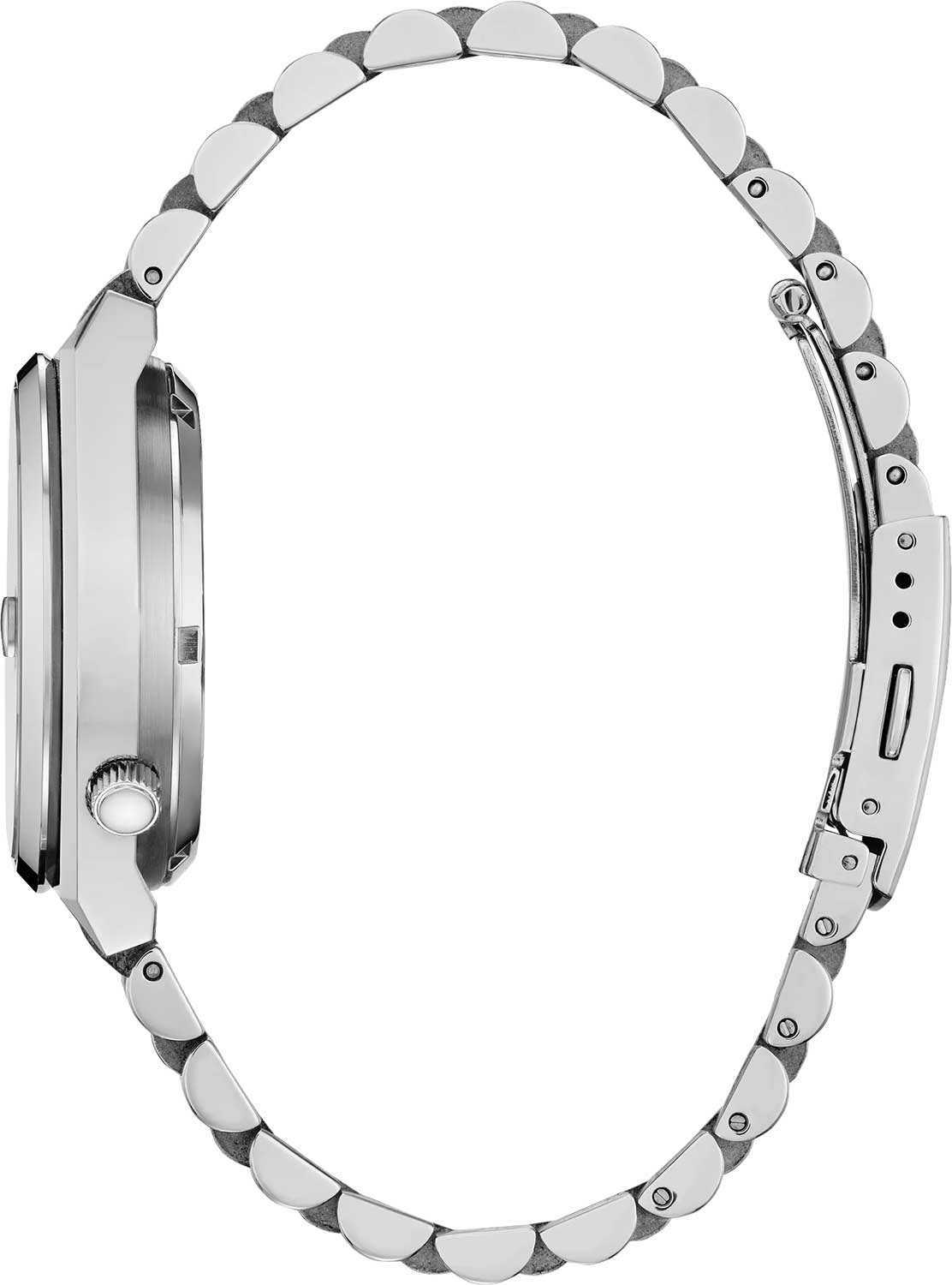 Окошко даты с увеличительным стеклом находится в положении 3 часа. Рифленая заводная головка находится в положении 4 часа. Завинчивающаяся прозрачная задняя крышка. Браслет с раскладывающейся застежкой.