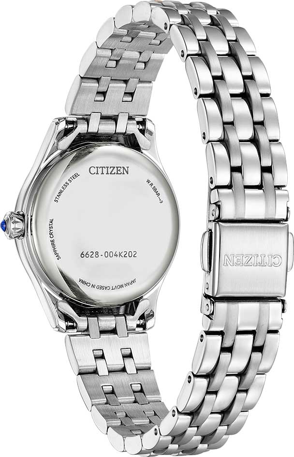 Перламутровый циферблат защищен прочным сапфировым стеклом. Заводная головка украшена камнем в форме кабошона. Браслет с раскладывающейся застежкой.