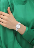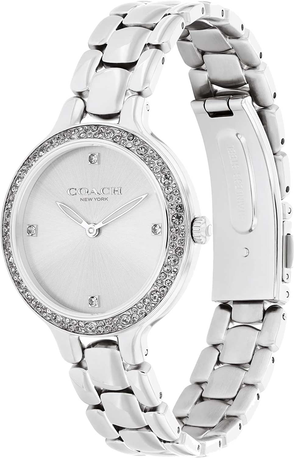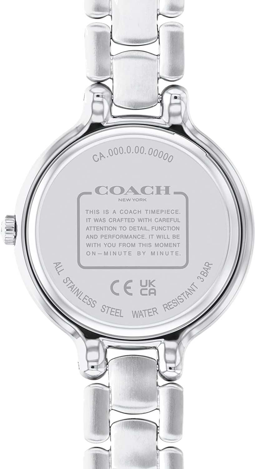 Скелетонизированные листовидные стрелки в стиле Feuille. Секундная стрелка отсутствует. Рифленая заводная головка. На задней крышке обращение от COACH к своим клиентам. Надежный стальной браслет с раскладывающейся застежкой.