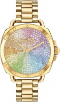 Женские часы со стальным корпусом. Циферблат без меток инкрустирован разноцветными кристаллами и дополнен фирменным знаком с конным экипажем. Рифленая заводная головка с защитой. На задней крышке обращение от COACH к своим клиентам. Стальной браслет с раскладывающейся застежкой.