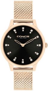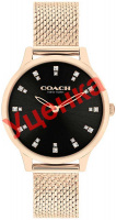 Женские часы с круглым корпусом. Циферблат выполнен по технологии Sunray (солнечные лучи). Метки в виде точек, украшенных кристаллами. Рифленая заводная головка. На задней крышке обращение от COACH к своим клиентам. Миланский браслет.
