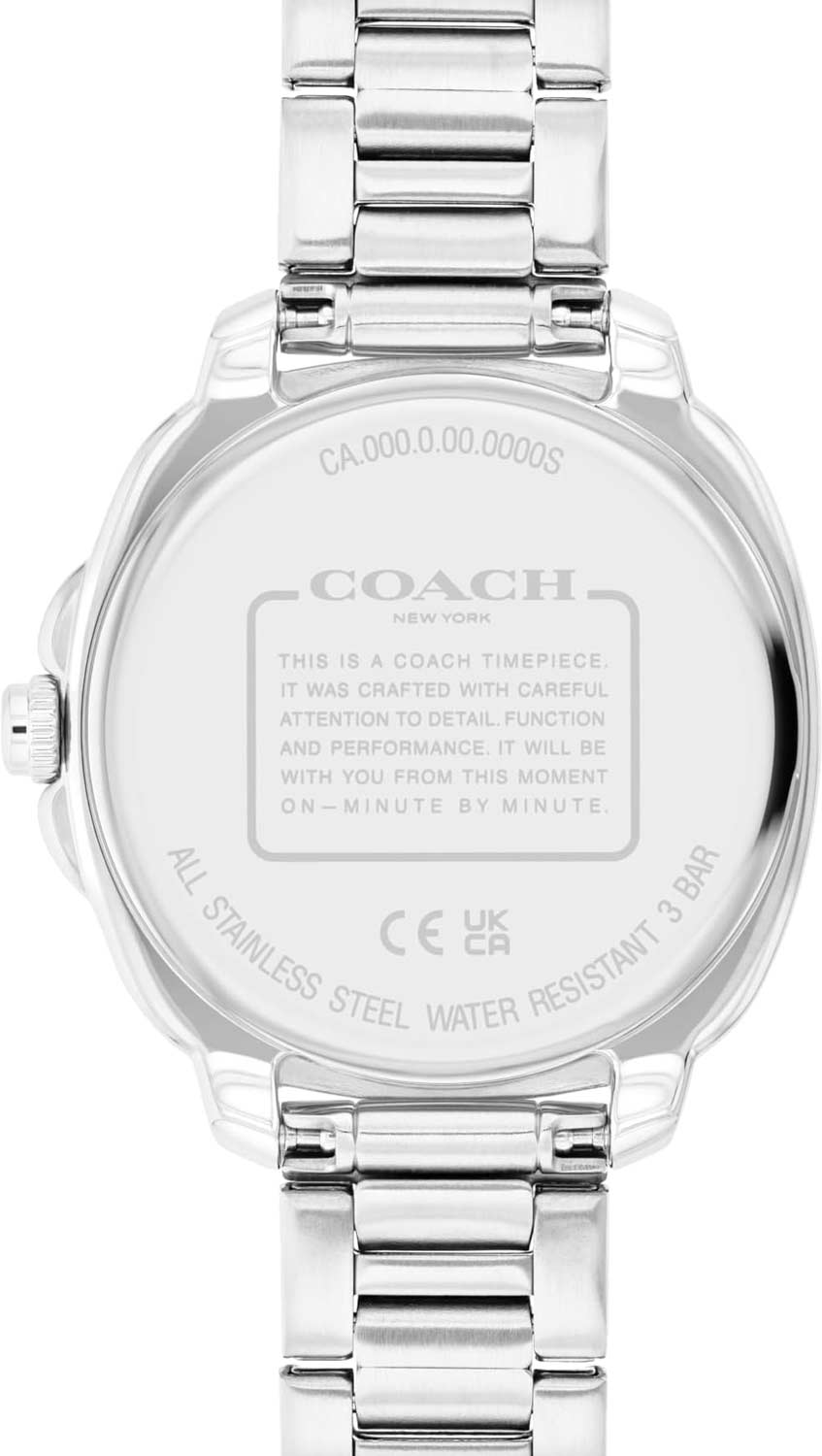 Время в 24-х часовом формате, дата и день недели отображаются на отдельных циферблатах. Рифленая заводная головка с защитой. На задней крышке обращение от COACH к своим клиентам. Надежный стальной браслет с раскладывающейся застежкой.
