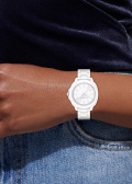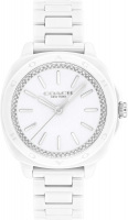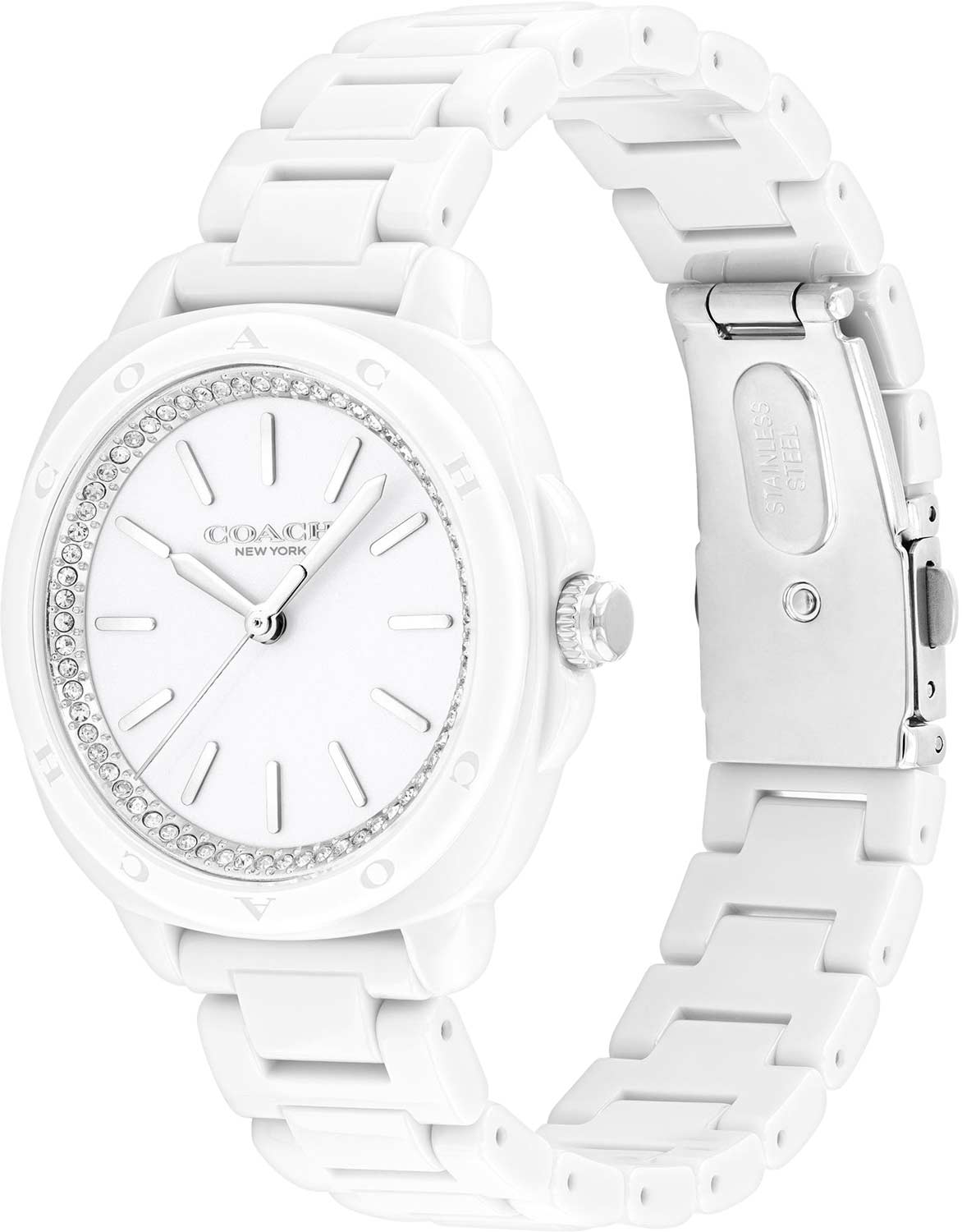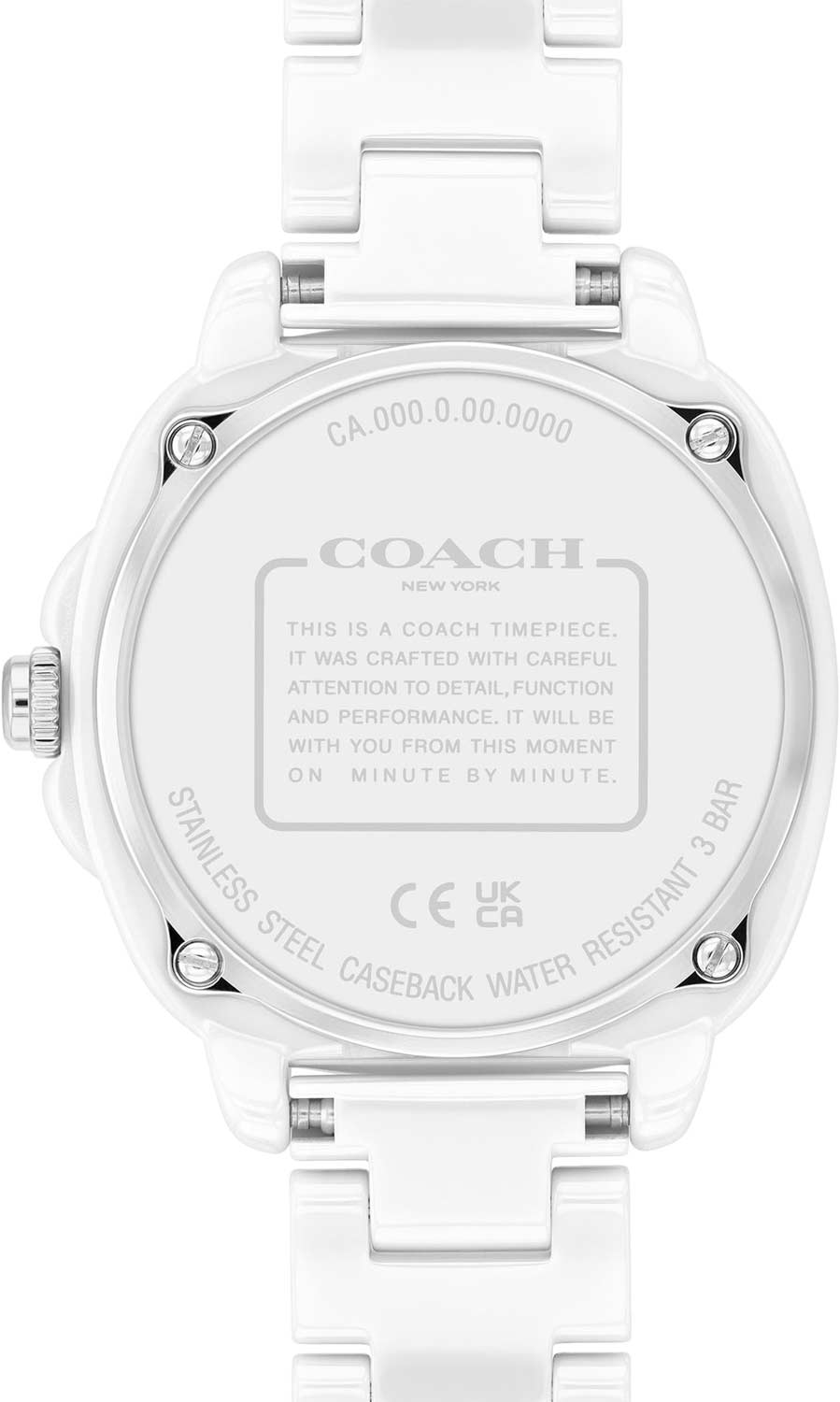 Метки в виде штрихов. Мечевидные стрелки в стиле Sword. Рифленая заводная головка с защитой. Задняя крышка крепится на 4-х винтах и имеет обращение от COACH к своим клиентам. Надежный керамический браслет с раскладывающейся застежкой.