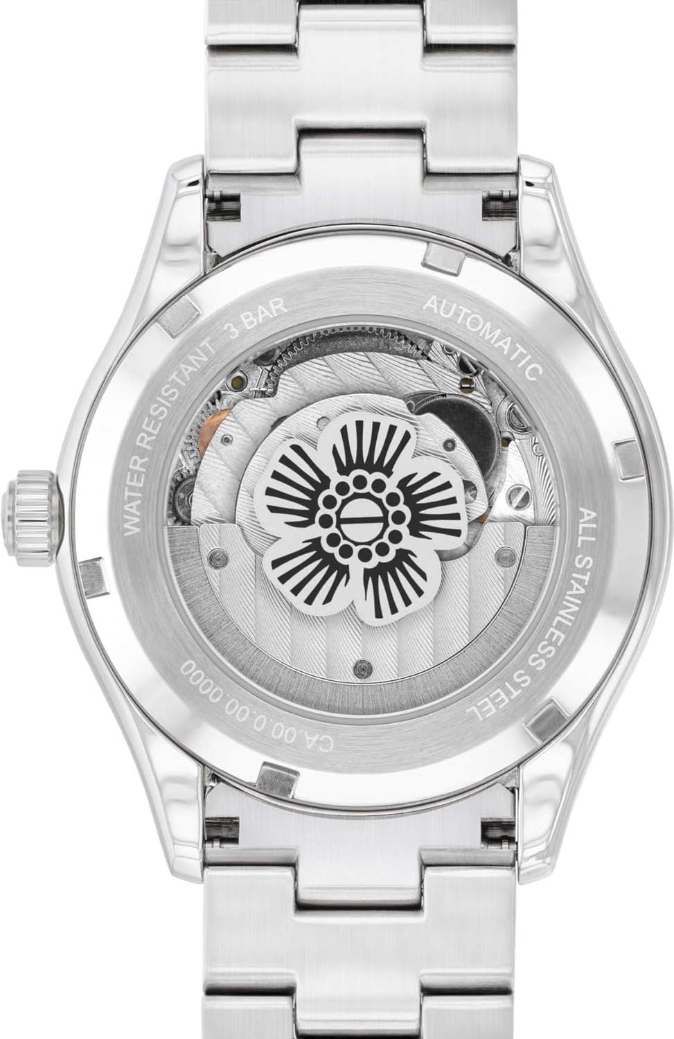 Узкие прямоугольные стрелки в стиле Baton. Секундная стрелка вынесена на отдельный циферблат. Рифленая заводная головка. Завинчивающаяся прозрачная задняя крышка. Надежный стальной браслет с раскладывающейся застежкой.