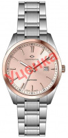 Женские часы с круглым стальным корпусом. Циферблат выполнен по технологии Sunray (солнечные лучи). Метки в виде штрихов. Окошко даты в положении 3 часа. Рифленая заводная головка. Стальной браслет.