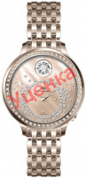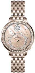Женские часы с круглым стальным корпусом. Метки в виде точек. Корпус и перламутровый циферблат украшены кристаллами. Рифленая заводная головка в положении 5 часов. Стальной браслет.