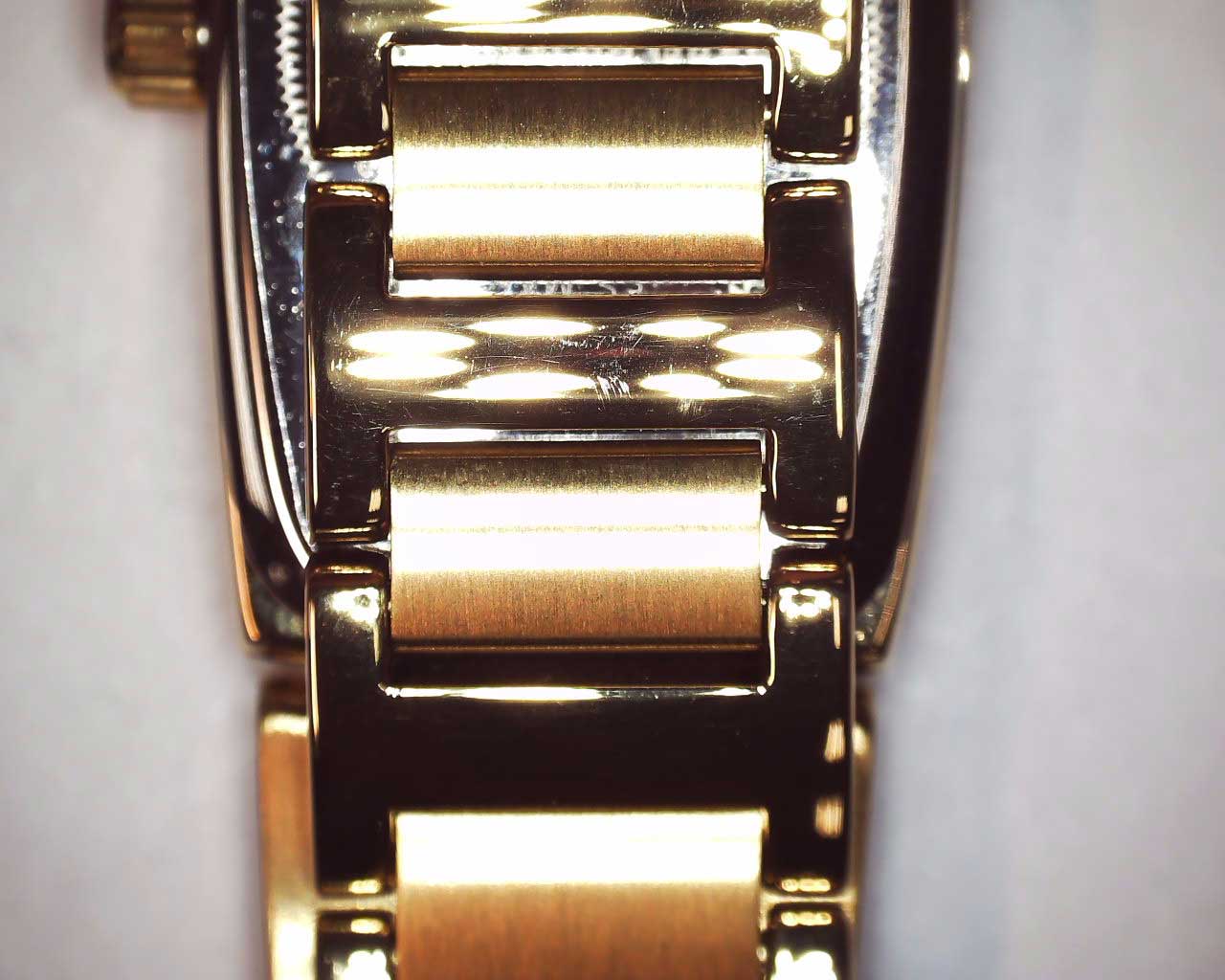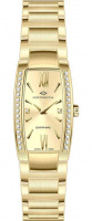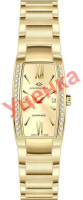 Женские часы со стальным корпусом. Безель и циферблат украшены кристаллами. Метки в виде штрихов и римских цифр 6,12. Рифленая заводная головка. Стальной браслет.