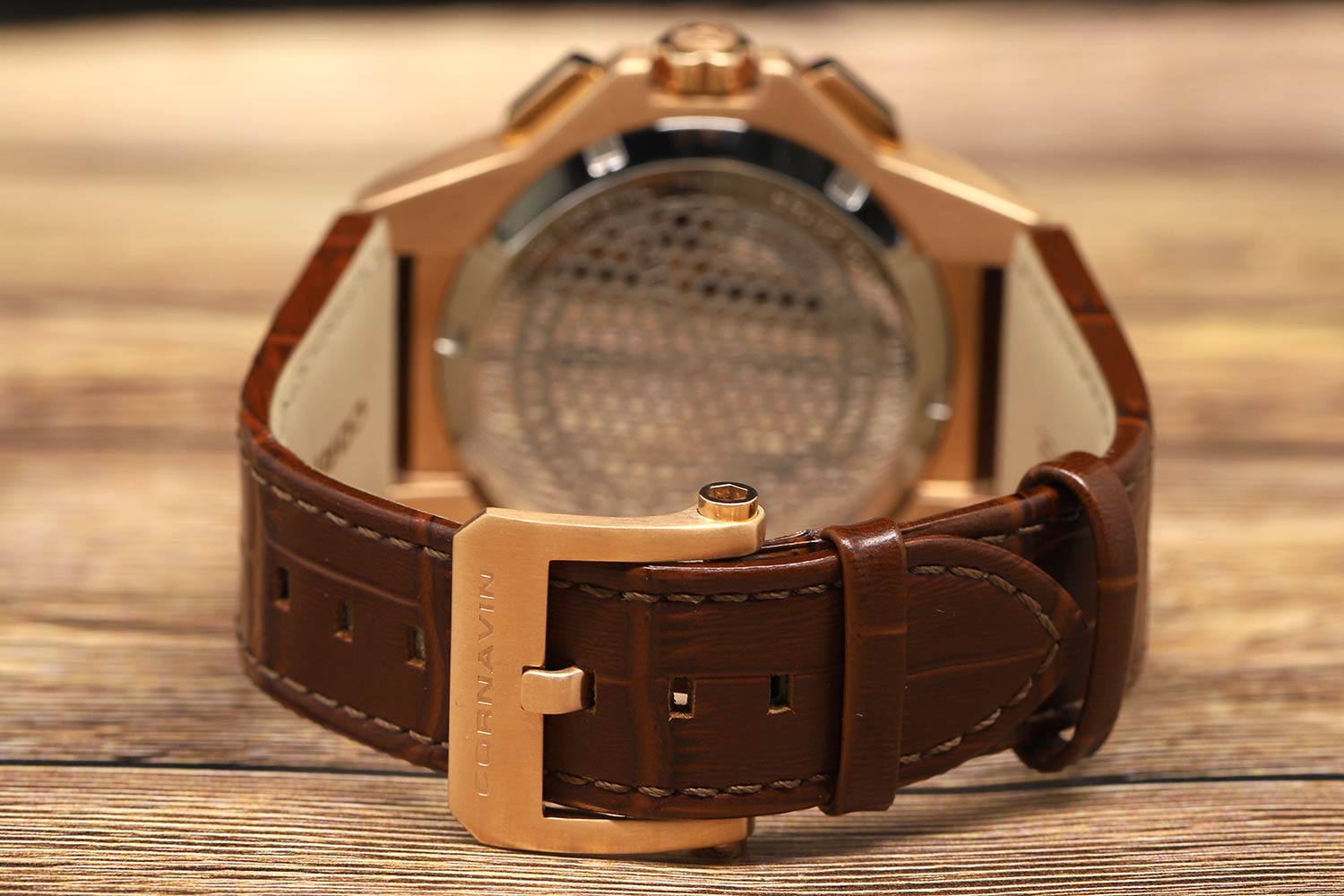 с прочным сапфировым стеклом. Эффектный восьмигранный безель украшен стильными винтами. Циферблат хронографа декорирован замысловатым узором из пересекающихся линий и логотипом Cornavin. Заостренные прямоугольные часовая и минутная стрелки с частично удаленным металлом покрыты фирменным люминесцентным
