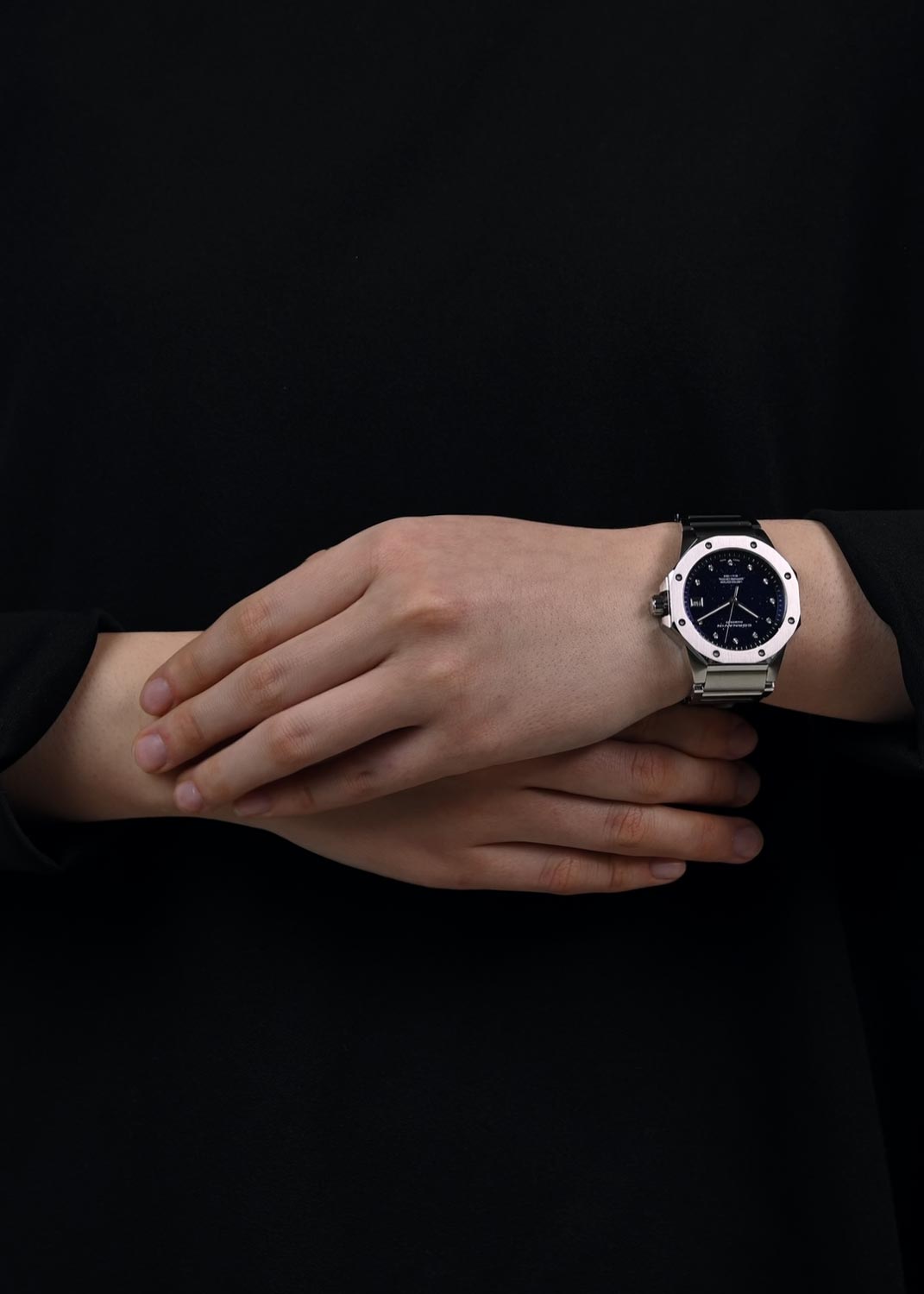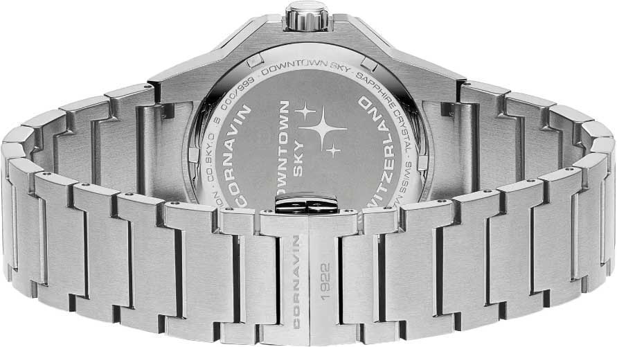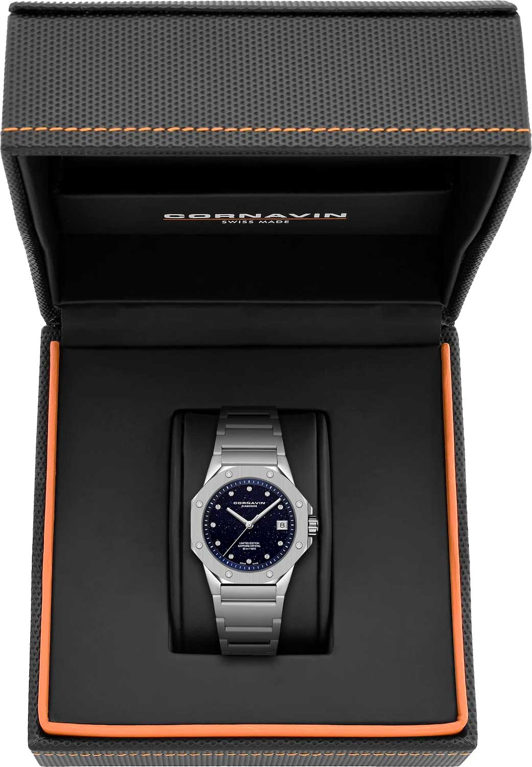 Циферблат с метками в виде точек выполнен из авантюринового стекла и декорирован логотипом Cornavin в положении 12 часов. Стрелки с люминесцентным покрытием, которое светится в темноте после непродолжительной зарядки на свету.