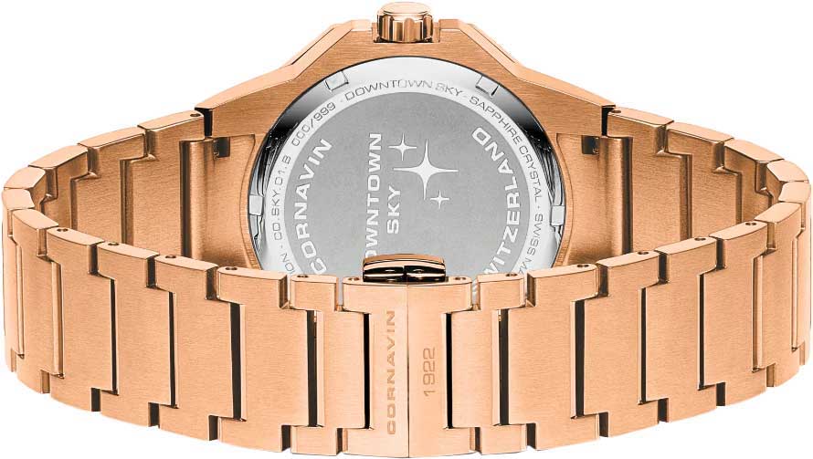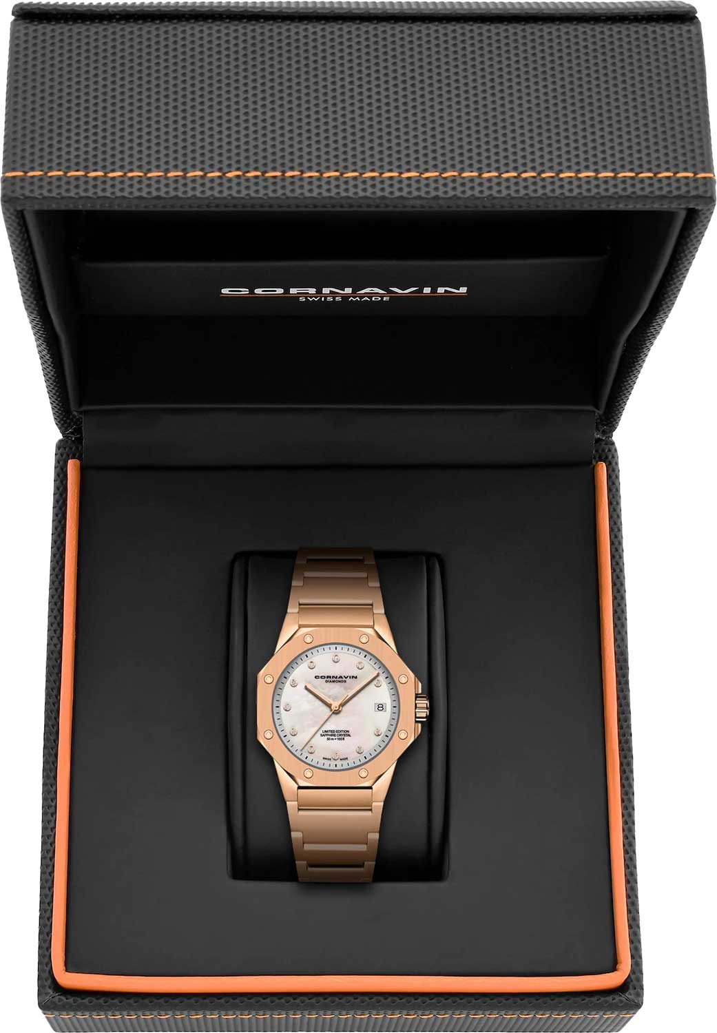 Перламутровый циферблат с метками в виде точек декорирован логотипом Cornavin в положении 12 часов. Стрелки с люминесцентным покрытием, которое светится в темноте после непродолжительной зарядки на свету.