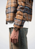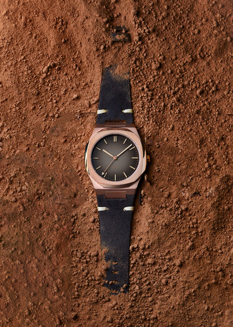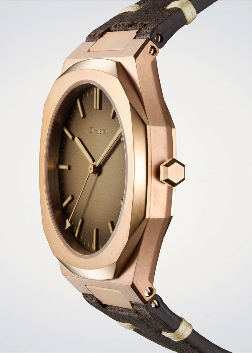 Корпус из бронзы. Коричневый циферблат с накладными метками в виде штрихов. Стрелки из латуни. Граненая заводная головка. Стальная задняя крышка крепится на 8-ми винтах. Кожаный ремешок с классической застежкой.