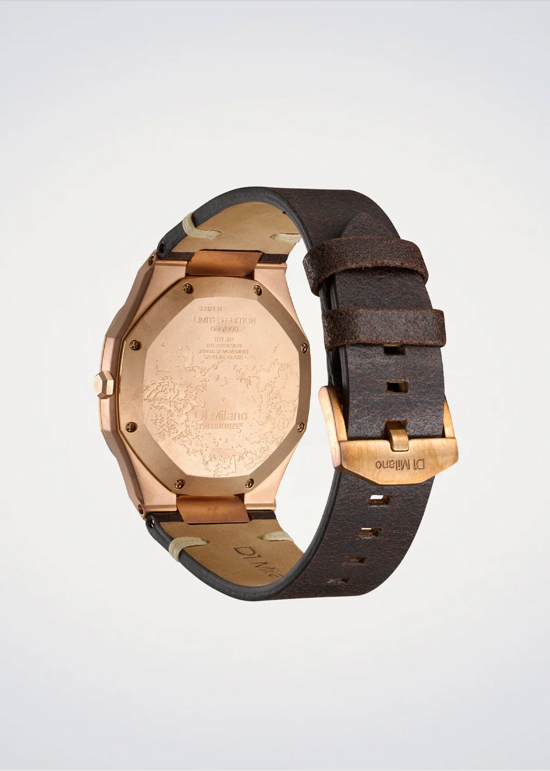 Корпус из бронзы. Коричневый циферблат с накладными метками в виде штрихов. Стрелки из латуни. Граненая заводная головка. Стальная задняя крышка крепится на 8-ми винтах. Кожаный ремешок с классической застежкой.