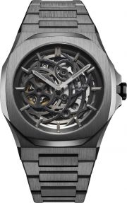 Gun Metal. Скелетонизированные часы. В механизме 24 камня, частота 21600 полуколебаний в час. Запас хода 41 час. Метки в виде штрихов. Заводная головка с защитой. Прозрачная задняя крышка крепится на 8-ми винтах. Браслет с раскладывающейся застежкой.
