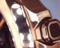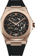 Rose Gold. Скелетонизированные часы. В механизме 24 камня, частота 21600 полуколебаний в час. Запас хода 41 час. Метки в виде штрихов. Заводная головка с защитой. Прозрачная задняя крышка крепится на 8-ми винтах. Ремешок с классической застежкой.