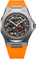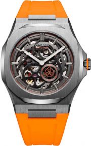 Скелетонизированные часы Slice Orange. В механизме 21 камень, частота 21600 полуколебаний в час. Запас хода 42 часа. Метки в виде штрихов. Заводная головка с защитой. Прозрачная задняя крышка крепится на 8-ми винтах. Ремешок с классической застежкой.