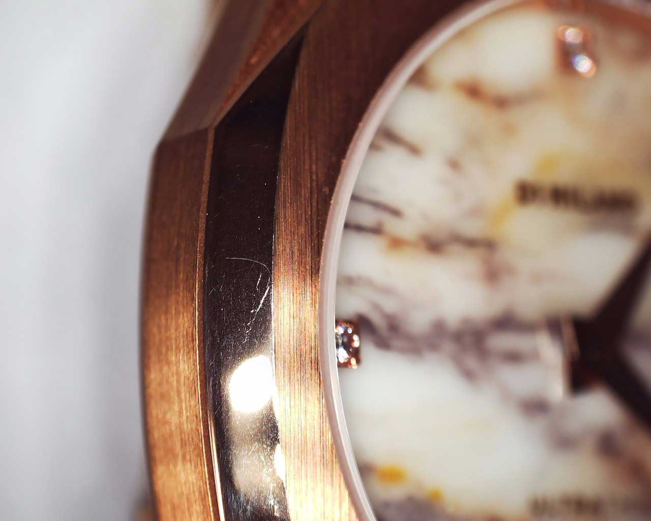 Rosegold Pink Marble. Ультратонкие часы со стальным корпусом. Циферблат из мрамора защищен прочным сапфировым стеклом. Метки в виде точек. Задняя крышка крепится на 8-и винтах. Индивидуальный серийный номер. Браслет с раскладывающейся застежкой.