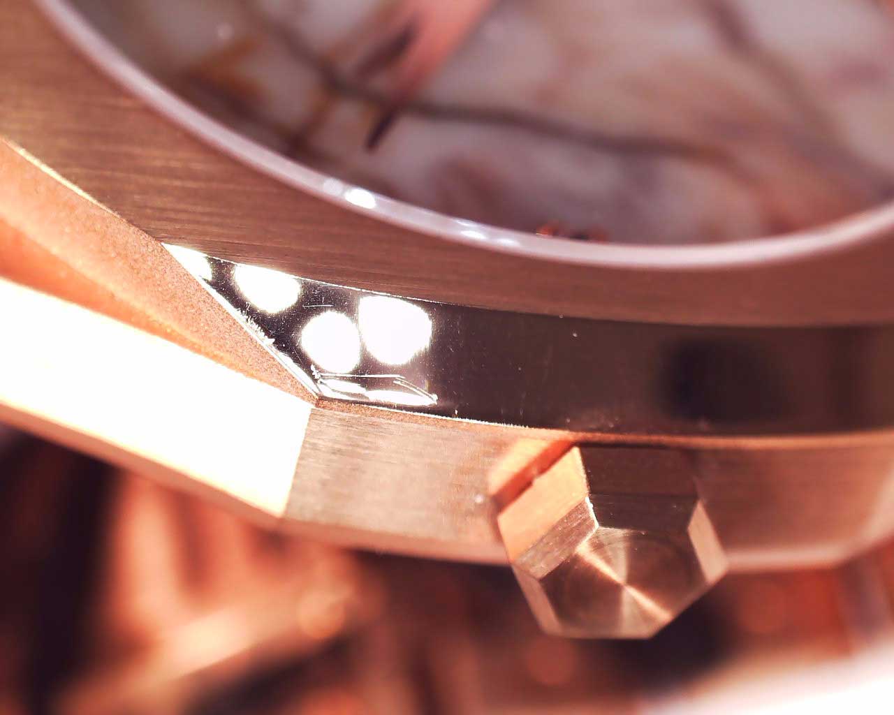 Rosegold Pink Marble. Ультратонкие часы со стальным корпусом. Циферблат из мрамора защищен прочным сапфировым стеклом. Метки в виде точек. Задняя крышка крепится на 8-и винтах. Индивидуальный серийный номер. Браслет с раскладывающейся застежкой.