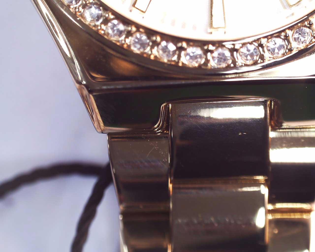 Premium. Яркие женские наручные часы. Круглый корпус с минеральным стеклом. Безель украшен паве из кристаллов. Циферблат украшен радиальным декоративным узором. Заостренные прямоугольные стрелки в стиле Baton. Метки в виде штрихов. Метки и стрелки с люминесцентным покрытием, которое светится в темноте после непродолжительной зарядки на свету. Рифленая заводная головка. Полированный стальной браслет с раскладывающейся застежкой.
