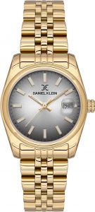 Женские кварцевые часы. Круглый металлический корпус с IP покрытием цвета желтого золота. Циферблат выполнен по технологии Sunray (солнечные лучи), украшен фирменным логотипом Daniel Klein в положении 12 часов и защищен ударопрочным минеральным стеклом. Метки в виде штрихов и стрелки с люминесцентным покрытием, которое светится в темноте после непродолжительной зарядки на свету. Окошко даты с увеличительным стеклом находится в положении 3 часа. Рифленая заводная головка. Стальной браслет с IP покрытием цвета желтого золота и раскладывающейся застежкой.