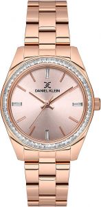 Женские кварцевые часы. Круглый металлический корпус с розовым IP покрытием. Безель украшен кристаллами. Циферблат выполнен по технологии Sunray (солнечные лучи), украшен фирменным логотипом Daniel Klein в положении 12 часов и защищен минеральным стеклом. Метки в виде штрихов и кристаллов багетной огранки в положениях 3, 6, 9,12 часов. Рифленая заводная головка. Стальной браслет с розовым IP покрытием и раскладывающейся застежкой.