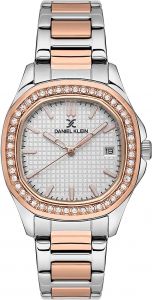 Женские кварцевые часы. Оригинальный металлический корпус с IP покрытием. Безель украшен паве из кристаллов. Циферблат с квадратным паттерном украшен фирменным логотипом Daniel Klein в положении 12 часов и защищен минеральным стеклом. Метки в виде штрихов и прямоугольные стрелки в стиле Baton с люминесцентным покрытием, которое светится в темноте после непродолжительной зарядки на свету. По краю циферблата нанесена секундная шкала с шагом 0,2 секунды. Окошко даты с увеличительным стеклом находится в положении 3 часа. Рифленая заводная головка с защитой. Стальной браслет с частичным розовым IP покрытием и раскладывающейся застежкой.