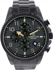 Мужские кварцевые часы. Круглый металлический корпус с черным IP покрытием. Циферблат выполнен по технологии Sunray (солнечные лучи), украшен фирменным логотипом Daniel Klein в положении 3 часа и защищен минеральным стеклом. Метки в виде арабских цифр, 3, 6, 9 и 12 часовые метки в виде штрихов. Метки и стрелки с люминесцентным покрытием, которое светится в темноте после непродолжительной зарядки на свету. Окошко даты находится между отметками 4 и 5 часов. 12-ти и 24-х часовой формат времени. Второй часовой пояс. Рифленая заводная головка с защитой. Частично полированный и сатинированный стальной браслет с черным IP покрытием и раскладывающейся застежкой.