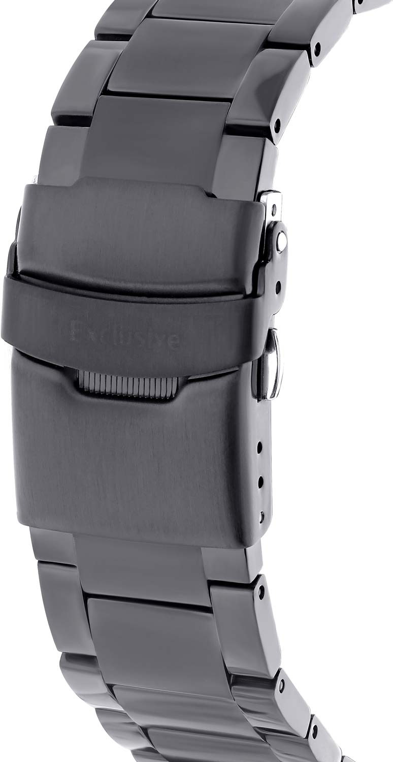 времени. Заводная головка с защитой. Частично полированный и сатинированный стальной браслет с черным IP