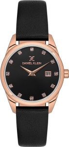 Premium. Круглый металлический корпус. Циферблат украшен фирменным логотипом Daniel Klein. Метки в виде точек, украшенных кристаллами. Окошко даты находится в положении 3 часа. Удобный ремешок из натуральной кожи с классической застежкой.