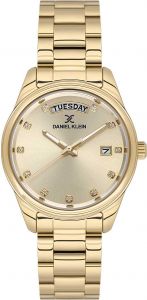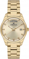 Женские кварцевые часы. Круглый металлический корпус. Циферблат выполнен по технологии Sunray (солнечные лучи) и украшен фирменным логотипом Daniel Klein. Метки в виде точек с кристаллами. Окошко даты находится в положении 3 часа. Окошко дня недели находится в положении 12 часов. Рифленая заводная головка. Стальной браслет с раскладывающейся застежкой.