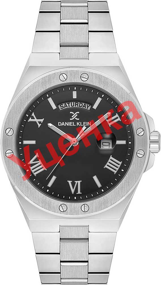 Мужские наручные часы. Круглый металлический корпус. Безель с декоративными винтами. Циферблат украшен фирменным логотипом Daniel Klein. Метки в виде штрихов и римских цифр. Окошко даты с увеличительным стеклом находится в положении 3 часа. Окошко дня недели находится в положении 12 часов. Рифленая заводная головка с защитой. Стальной браслет с раскладывающейся застежкой.