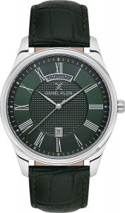 Мужские наручные часы. Круглый металлический корпус. Комбинированный циферблат украшен фирменным логотипом Daniel Klein. Метки в виде римских цифр. Окошко даты находится в положении 6 часов. Окошко дня недели находится в положении 12 часов. Рифленая заводная головка. Кожаный ремешок с классической застежкой.