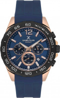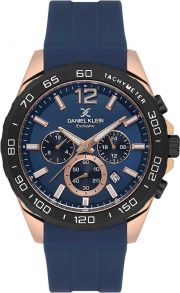 Мужские часы-хронограф с секундомером и тахиметром. Круглый металлический корпус. 12-ти и 24-х часовой формат времени. Циферблат выполнен по технологии Sunray (солнечные лучи) и украшен фирменным логотипом Daniel Klein. Метки в виде штрихов и арабской цифры 12. Окошко даты находится между часовыми метками 4 и 5. Рифленая заводная головка с защитой. Силиконовый ремешок с классической застежкой.