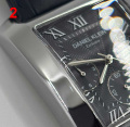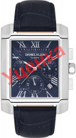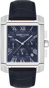 Часы-хронограф с секундомером. Прямоугольный металлический корпус. 12-ти и 24-х часовой формат времени. Гильошированный циферблат украшен фирменным логотипом Daniel Klein. Метки в виде римских цифр. Окошко даты находится между часовыми метками 4 и 5. Шестигранная заводная головка. Кожаный ремешок с классической застежкой.