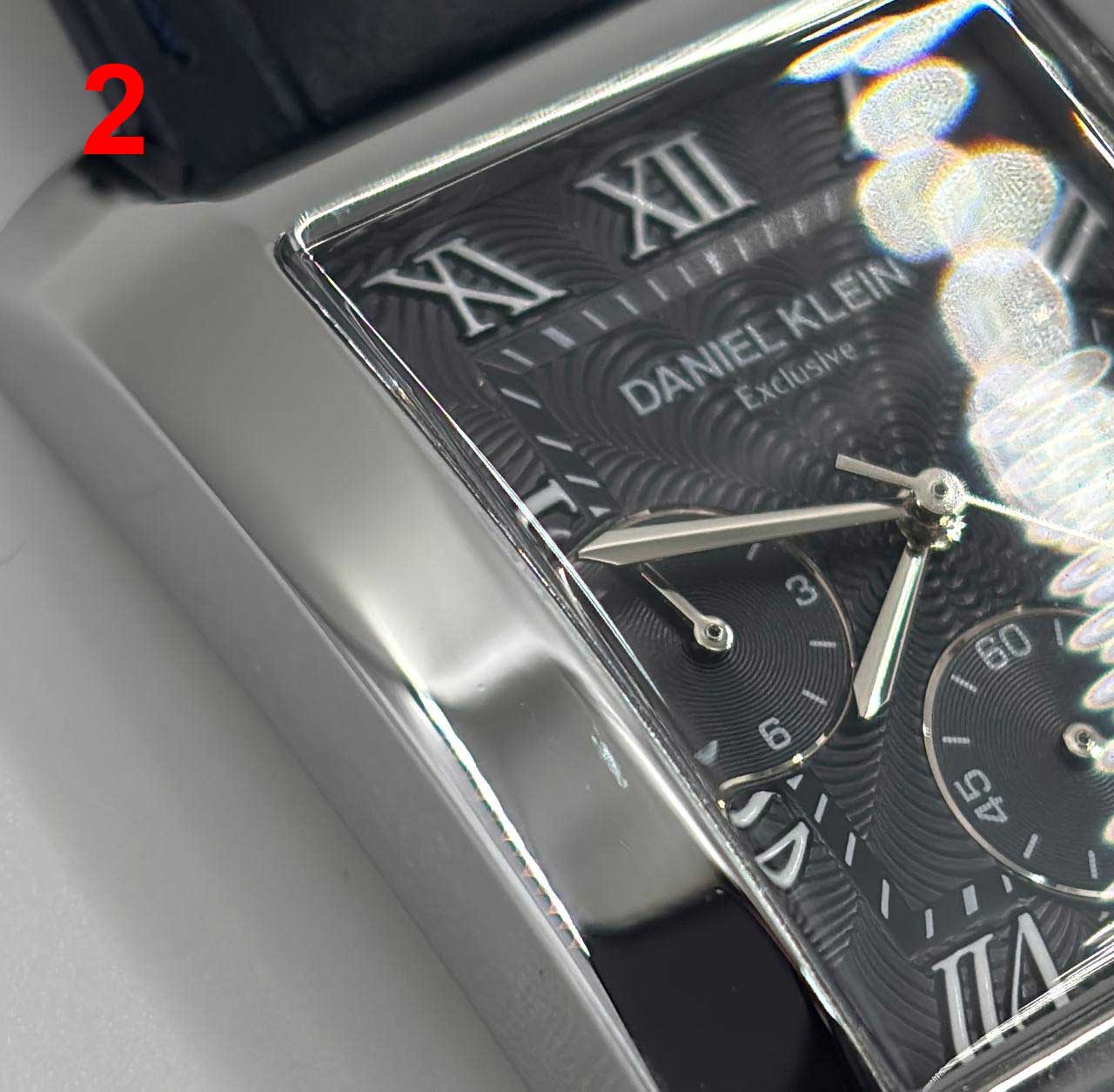 Часы-хронограф с секундомером. Прямоугольный металлический корпус. 12-ти и 24-х часовой формат времени. Гильошированный циферблат украшен фирменным логотипом Daniel Klein. Метки в виде римских цифр. Окошко даты находится между часовыми метками 4 и 5. Шестигранная заводная головка. Кожаный ремешок с классической застежкой.