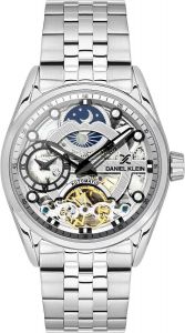 Скелетонизированные часы. Круглый металлический корпус. Второй часовой пояс. Циферблат украшен фирменным логотипом Daniel Klein. Метки в виде точек и штрихов. Рифленая заводная головка. Стальной браслет с раскладывающейся застежкой.