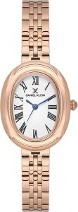 Аккуратные женские наручные часы. Металлический овальный корпус. Матовый циферблат украшен фирменным логотипом Daniel Klein. Метки в виде римских цифр. Рифленая заводная головка. Браслет с раскладывающейся застежкой.
