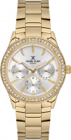 Дизайнерские наручные часы для женщин. Круглый металлический корпус. Безель украшен кристаллами. 12-ти и 24-х часовой формат времени. Циферблат выполнен по технологии Sunray (солнечные лучи) и украшен фирменным логотипом Daniel Klein. Метки в виде штрихов. Время в 24-х часовом формате, дата и день недели отображаются на отдельных циферблатах. Рифленая заводная головка. Браслет с раскладывающейся застежкой.