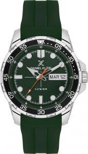 Практичные наручные часы для мужчин. Металлический круглый корпус. Безель с минутной шкалой. Матовый циферблат украшен фирменным логотипом Daniel Klein. Метки в виде точек и штрихов. Окошко даты находится в положении 3 часа. Рифленая заводная головка с защитой. Удобный силиконовый ремешок с классической застежкой.