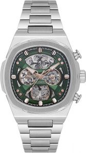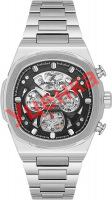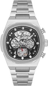 Мужские механические скелетонизированные часы с автоподзаводом. Квадратный металлический корпус. На отдельных циферблатах отображаются 24-х часовой формат времени, дата и день недели. Метки в виде штрихов. Граненая заводная головка с защитой. Стальной браслет с раскладывающейся застежкой.