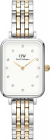Наручные ультратонкие женские кварцевые часы Quadro Lumine 5-link two-tone. Стальной прямоугольный корпус с полированной отделкой. Надежный японский кварцевый механизм. Матовый циферблат украшен фирменным логотипом Daniel Wellington. Накладные метки в виде точек, украшенных кристаллами. Рифленая заводная головка. Практичный стальной браслет с раскладывающейся застежкой.